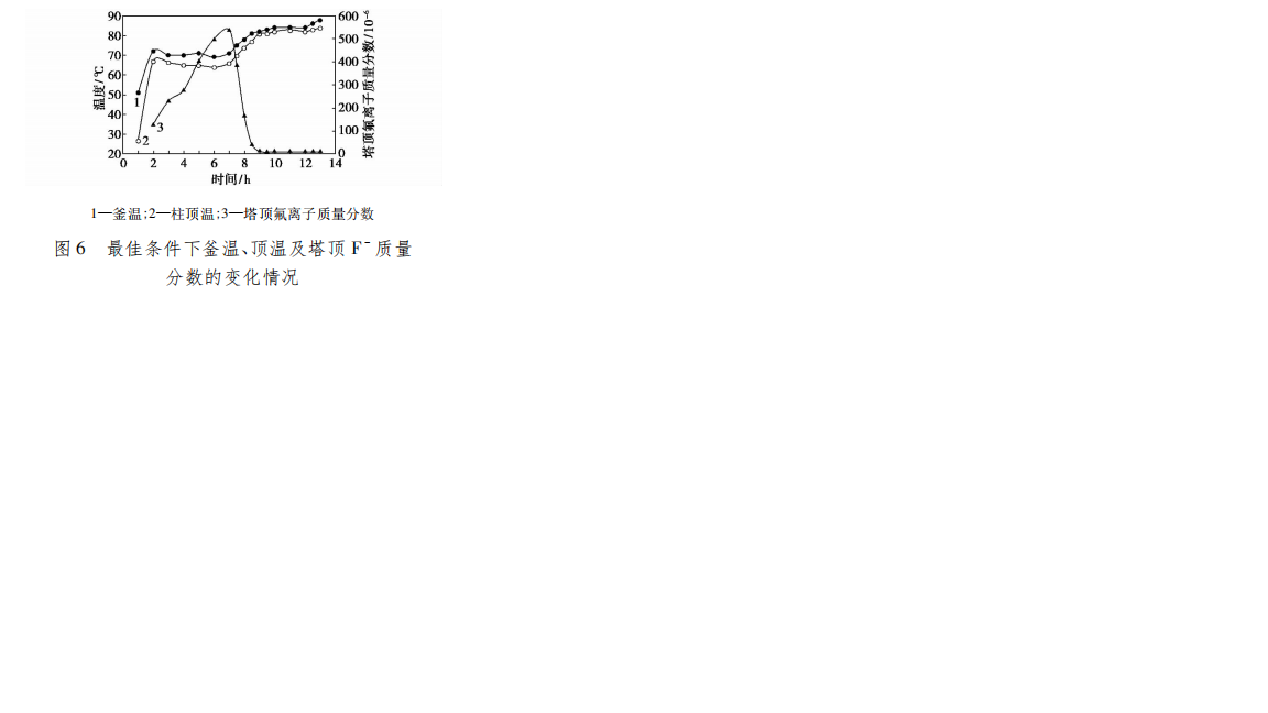 在 LiTFSI的间歇减压精馏实验中在规定了各项最佳工艺参数后,整个精馏过程的釜温、柱温变化规律也相应确定。由于在不同的操作温度下,对应产品的组分差异会有变化,因此,在真空度稳定且供热量稳定的前提下,系统的釜温和柱温可以在一定程度上反映精馏的效果和产品的质量。本实验选取了之前确定的全部最佳工艺参数后,进行一次完整的精馏过程,实时记录釜温、柱温和塔顶氟离子质量分数的变化情况,具体温度变化见图 6。从图 6 可以看出,全回流刚开始阶段,釜温和柱温快速上升,气液相平衡迅速建立。温度经过一段波动后逐渐趋于稳定,釜温在 70℃ 附 近,柱 温 约66℃,各组分浓度在塔顶的分布也基本确定。6 h后开始收集过渡馏分,由于大量轻组分随过渡馏分采出,釜底轻组分含量迅速减少,釜温明显上升,柱温稳定中略有升高。过渡馏分收集结束后,进入产品收集阶段,此过程柱温和釜温十分稳定,几乎没有变化,釜温基本维持在 84℃ 左右,柱温 70℃ 左右。直到产品收集末期,釜温柱温同时有上升的趋势,此时会有三氟甲磺酰胺等重组分杂质蒸出,应立即停止收集。