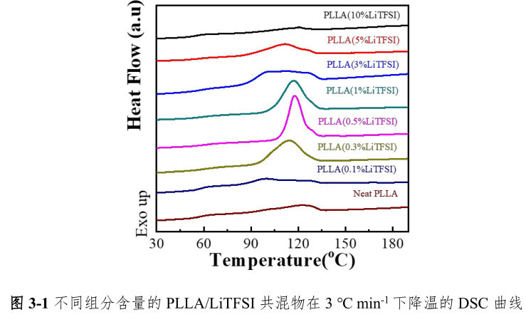 图 3-1 为不同组分含量的 PLLA/LiTFSI 共混物在 3 o C min -1 降温条件下的非等温结晶曲线。如前文所述,PLLA 是一种结晶速率非常慢的半结晶性聚合物,所以在图 3-1 中纯 PLLA 在降温过程中只有非常微弱的结晶峰而随着 LiTFSI 的添加量的增加,PLLA 的结晶峰逐渐增大。当 LiTFSI 的添加量为 0.5%,继续提高 LiTFSI 的含量,PLLA 的结晶峰又逐渐减小,直至添加量为 10%时,PLLA 几乎没有结晶峰。
