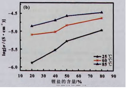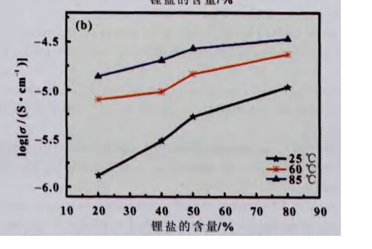 固定增塑剂含 量为50%, LITFSI含量对SPE电导率的影响如图 1所示。 随 LITFSI含量增加在各温度下SPE电导率随之 增大 , 当 LITFSI含量超过 10%,SPE电导率不再提高 ,而是有下降趋势 。 在低锂盐浓度时 ,随锂盐浓度增加体系中的自由离子数增多 ,离子电导率亦随之增 大。当低锂盐浓度超过临界点后 ,自由离子易形成离子对 ,离子对的形成对 电导率不但没有贡献 ,反而对 自由离子的传输增大其位垒 , 降低其电导率 。在 PAN/EVA/LITFSI体系中LITFSI最佳浓度为10%。恒定LITFSI含量为4%, 增塑剂浓度对SPE电导率的影响如图2.