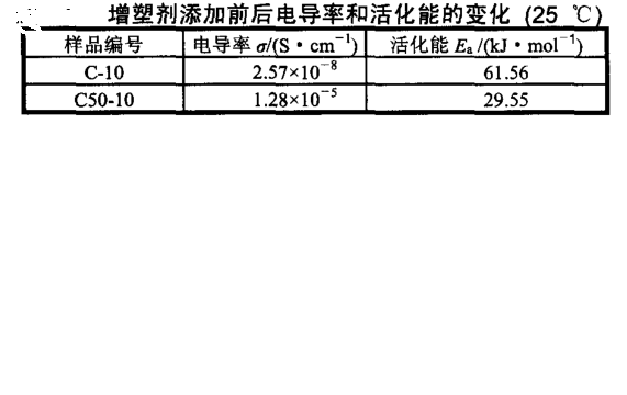 图 3 是C-10和 C50-10样品离子电导率的比较 。 在锂盐含量均为10%时 , 无 2一氰 基 乙醚增 塑剂 的SPE电导 率为2.57x10-8S/cm(25 ℃),添加质量分数为 50% 2一氰基乙醚增塑剂的 SPE电导率为 1.28x10-5S/cm (25℃ ),2一氰基 乙醚增塑剂 的加入使室温下 SPE 电导率提升 约 3个 数量级 。 根据 图2 的数据可以计算 得出 C-10和 C50-10离子 传导 活化能 (图4)。 显然增 塑剂的加入降低了 离子传导活化能,增大了离子传输能力 ,提高了SPE膜的离子电导率。