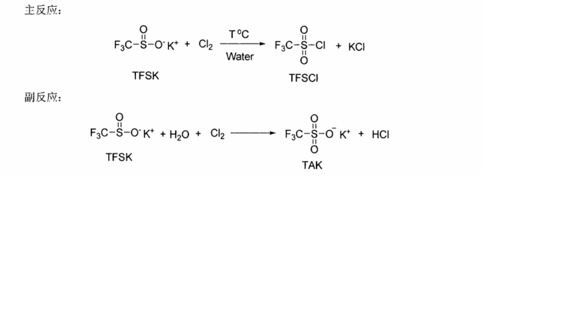 1)三氟甲基亞磺痠鉀(TFSK)水溶液採用氯氣氯化生成三氟甲基磺醯氯(TFsCl)併精餾提純。