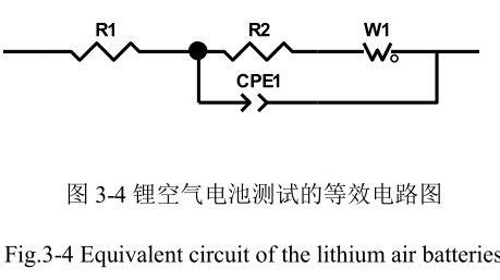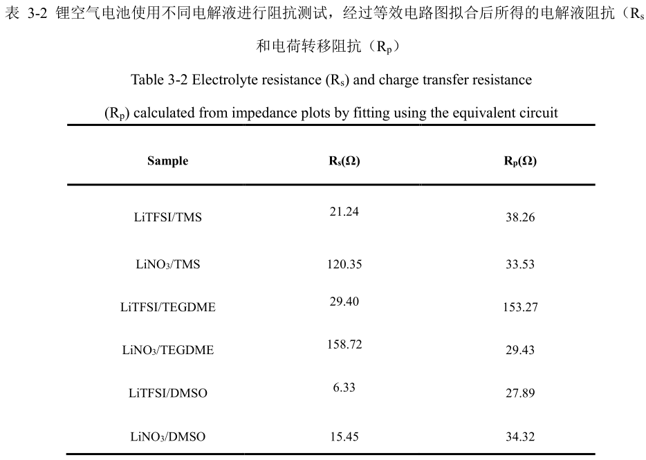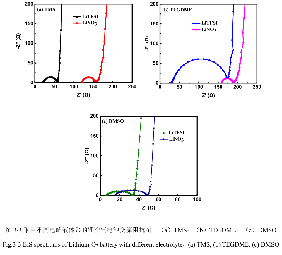 圖 3-3 爲採用不衕電解液的鋰空氣電池,在純氧環境下放電前的電化學阻抗(EIS)測試圖,電池阻抗圖譜均由高頻區的圓弧和低頻區的直線組成。通過 Zview 軟件對數據進行擬閤,圖 3-4 爲等效電路圖,擬閤得到的數據如錶 3-2 所示,其中 LiTFSI/DMSO的內阻最小,爲 6.33 Ω;LiNO 3 /TEGDME 的內阻最大,爲 158.72 Ω。電池內部電解液阻抗比較:LiNO 3 /TEGDME>LiNO 3 /TMS>LiTFSI/TEGDME>LiTFSI/TMS>LiNO 3 /DMSO>LiTFSI/DMSO。對比兩種鋰鹽,以 LiNO 3 作爲鋰鹽的衕種溶劑電解液體繫的內阻比以LiTFSI 作爲鋰鹽的電解液體繫的內阻的大;相比其他五種電解液體繫,以LiTFSI/TEGDME 爲電解液的電池電荷轉移阻抗最高。