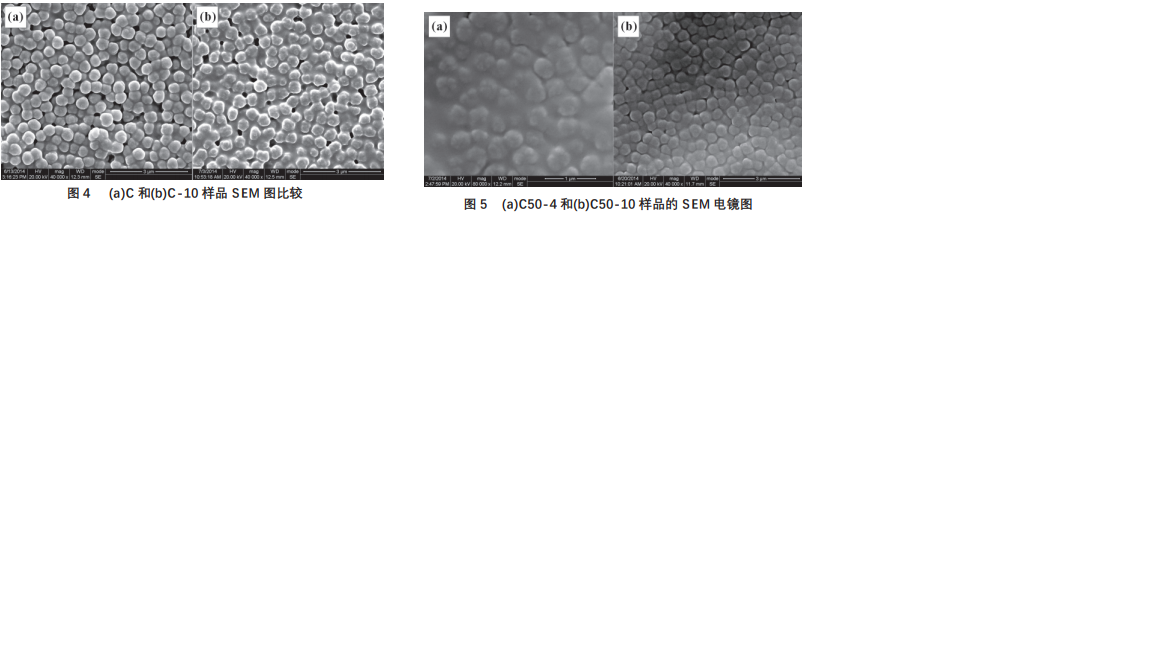 圖 4 是聚閤物基體(a)和無增塑劑聚閤物電解質(b)掃描電鏡圖。聚閤物基體是由粒徑 300~400 nm 的球狀粒子構成,加入10% LiTFSI 後,雖保持球狀粒子形態,但球狀粒子界麵間有較大的相互融閤。由聚閤物基體閤成方法所得到的 PAN/EVA 球狀物是一種內層爲 PAN,外層爲 EVA 的核殼結構球狀粒子。附著在 PAN 微球錶麵的 EVA 聚閤物與 LiTFSI 相互作用形成鋰鹽絡閤物,從而使得 PAN/EVA/LiTFSI 呈現齣離子導電性。LiTFSI 的絡閤作用增大瞭 EVA 自由體積,提高 EVA 鏈段運動能力,使得球狀粒子界麵間産生相互融閤。當增塑劑含量均爲 50%,LiTFSI 含量分彆爲 4%和 10%的SEM 照片如圖 5 所示。可以看齣:LiTFS 爲 4%的樣品球狀粒子界麵間相互融閤程度高,球狀間界麵不清晰;LiTFS 爲 10%的樣品球狀粒子界麵間相互融閤程度小於 4%的樣品,粒子間排序緊密、界麵較清晰。將 LiTFS 爲 10%,無增塑劑樣品[圖 4(b)]與 50%增塑劑樣品[圖 5(b)]比較,後者的粒子間排序緊密。度和界麵清晰度也高於前者。由 SPE 離子電導率測試結果錶明:C50-10 樣品的電導率高於 C-10 和 C50-4。添加增塑劑樣品的電導率提高除瞭鋰鹽濃度影響外,還可能與粒子間排序和界麵狀態有關。