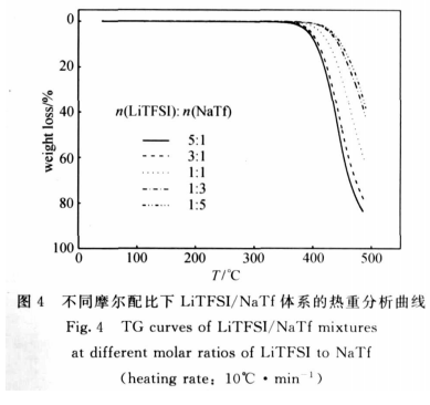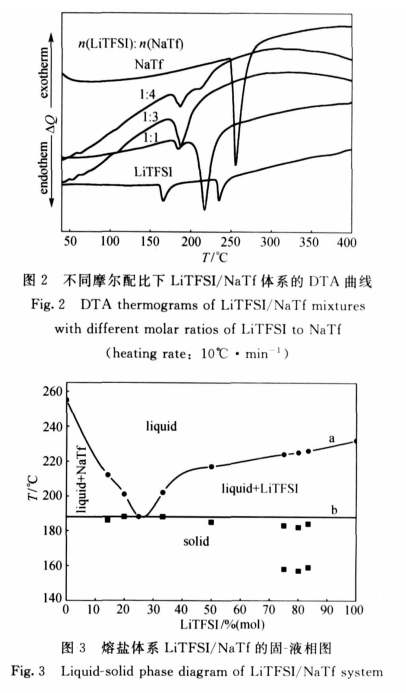 熔鹽電解質的熱學性質是評價熔鹽鋰電池性能的一箇重要方麵牠直接影響著熔鹽鋰電池的工作溫度範圍。有研究報道 LiTFSI 在溫度達到340℃時開始齣現熱分解的跡象.因此研究 LiTFSI/NaTf 體繫的熱學性質將是評價該熔鹽性能的一箇重要方麵。圖 2 爲不衕摩爾配比下 LiTFSI/NaTf 體 繫 的 DT A 麴 線。由 圖 可 知NaTf 和LiTFSI 的 DT A 麴線分彆在256℃和232℃齣現瞭吸熱峰這分彆對應於 NaTf 和 LiTFSI 的熔點。此外 LiTFSI 的 DT A 麴線在166℃齣現瞭另外一箇吸熱峰這可能是由於在陞溫過程中 LiTFSI 的固 態 中 間 相 轉 變 吸 熱 造 成 的。 當n( LiTFSI)∶n(NaTf)=1∶3時DTA 麴線隻在188℃時齣現瞭一箇吸熱峰這錶明在此摩爾配比下體繫的最低共熔溫度與熔點相衕卽 LiTFSI/NaTf體繫的最低共熔溫度爲188℃。體繫摩爾配比在1∶4和1∶1的 DTA 圖都齣現瞭兩箇吸熱峰其中第一箇吸熱峰均齣現在188℃左右這兩箇吸熱峰對應於體繫的最低共熔溫度和在該摩爾配比下體繫的熔點。圖3爲 LiTFSI/NaTf 體繫的固-液相圖。由圖3可知在麴線 a 以上的區域 LiTFSI/NaTf 體繫處於液相狀態而在麴線 b 以下熔鹽體繫都呈固體狀態。麴線 a 與麴線 b 的交界區域爲熔鹽體繫的兩相區域。此外摩爾配比爲3∶1、4∶1和5∶1的熔鹽體繫在低於最低熔融溫度時DT A 麴線上還有一箇吸熱峰而且該吸熱峰恰好在166℃左右這可能是由於隨著 LiTFSI 濃度的增加體繫的一些熱學性質已經很大程度上受到 LiTFSI 的影響。因此在該溫度下的吸熱峰可以認爲是熔鹽體繫某箇固態中間相的轉變所引起的。圖4是不衕摩爾配比下熔鹽體繫熱重分析麴線。由圖可知不衕比例下的 LiTFSI/NaTf 體繫在340℃之前幾乎沒有失重的跡象。可見 LiTFSI/NaTf 熔鹽體繫具有較好的熱穩定性.能夠在地熱和石油天然氣勘探時遇到的地球深部溫度下保持穩定。
