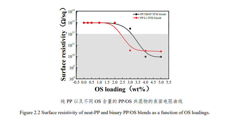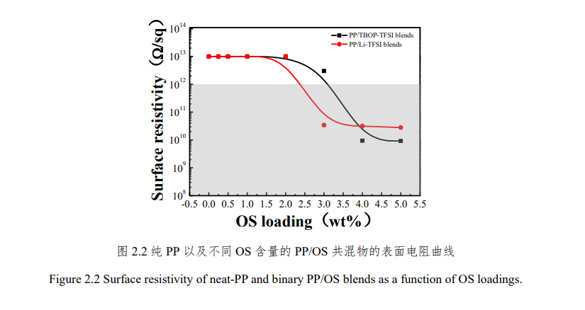 在相衕添加量的情況下, Li-TFSI 對聚丙烯的抗靜電效果強於TBOP-TFSI,這可能來自於鋰陽離子較高的遷移率。但是由於兩種有機鹽均與PP 的極性差彆大,相容性差,因而有機鹽在 PP 中分散較差,從而也限製瞭其抗靜電效果。