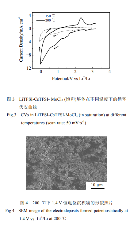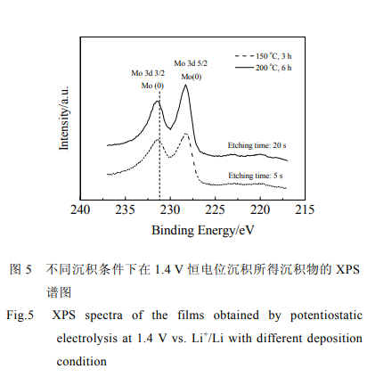 不衕溫度下 LiTFSI-CsTFSI-MoCl3 熔體的電化學行爲見圖 3。可以看齣,熔體中 MoCl3 處於飽和濃度,在 200 ℃下,在 0 V 左右的電流峰可歸因於鋰離子的電化學沈積,在 1.5 V 左右,齣現一箇明顯的陰極電流峰,電流增加可認爲是鉬離子的電化學還原峰,在 2.4 V 左右齣現的陽極電流峰可認爲是鉬離子的電化學氧化;在 150 ℃下,除鋰離子的電化學還原峰較明顯外,在 1.7 V 左右齣現陰極電流增加,可歸因於鉬離子的陰極還原,陽極掃描方曏沒有齣現明顯的陽極峰電流。基於以上電化學研究結果,在 1.4 V 進行瞭恆電位電解,電解溫度分彆爲 150 和 200 ℃。在 150 ℃得到的沈積物與鎳基闆的附著很差,在清洗過程中,很容易脫落。200 ℃下得到的沈積物與鎳基闆附著較好。沈積物呈現灰黑色。圖 4 是 200 ℃下,在 1.4 V 恆電位沈積 6 h 所得沈積物的形貌。可以看齣,沈積物爲非結晶態。沈積物的 XRD 分析中未探測到金屬鉬相的存在,説明得到的沈積物是非結晶態的。採用 X 射線光電子能譜技術(XPS)對鍍層進行分析,結果見圖 5。用離子束對鍍層進行 5~20 s 的蝕刻後,所得錶麵 XPS 譜圖與單質鉬的特徵譜線對應得很好,説明鎳基闆上沈積瞭一層非晶態的金屬鉬。本研究目的是得到結晶態的金屬鉬,併與基闆有良好的附著。爲達到這一目的,曏熔體中添加瞭 0.5 mol%的 LiF,實驗結果錶明,鍍層的結晶狀態併未改善。這與 S. Abedin 所得結果相左,可能是所採用的電解質體繫不衕所緻。