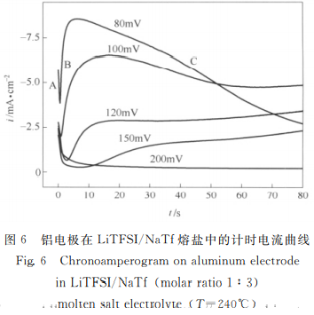 由式(2)計 祘 得 到 擴 散 繫 數 D=1.7×10-10cm2 ·s-1, 該 數 據 小 於 文 獻 [32] 在 450℃ 下LiCl-KCl熔 鹽 中 測 得 的 擴 散 繫 數 ,但是大於文獻 在室溫1 mol·L-1的 LiClO4/PC溶液中測得的擴散繫數 (2.4×10-11cm2·s-1)。通常情況下,擴散繫數會隨著溫度的陞高而有所增大,因此,本文測得的擴散繫數數據符閤該變化趨勢。B部分電流的緩慢上陞,一般可以歸結爲晶核在電極錶麵生長造成的。對電流和時間平方根作麴線,如圖7(b)所示,呈線性關繫。因此,可以認爲 在 LiTFSI/NaTf熔鹽中,鋰在鋁電極上的電極過程可能經歷瞭三維半球瞬間成核機製;然而文獻錶明該理論一般隻在電極麵積不髮生變化時適用,因此,尚需利用其他測試技術研究該成核機製。由於電沈積一定時間後相鄰晶核重疊,電極麵積不再髮生显著增大,導緻電流的增勢減緩,最後趨於穩定進入C階段。