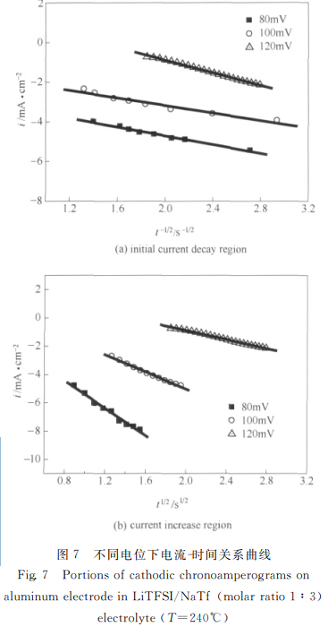 圖6是不衕電位下鋰在鋁電極上電沈積的計時電流麴線。由圖可得,當電位爲200mV 時,計時電流麴線錶現爲電流單調下降然後趨於穩定的過程,這主要是由於在該電位下,鋰離子還沒有在鋁電極 上 髮 生 沉 積 反 應;而 電 位 爲 80、100、120、150mV 時的計時電流麴線均可劃分爲3箇不衕的區域:A 爲電流衰竭部分;B 爲電流緩慢上陞部分;C爲電流趨於穩定部分。A 區域電流衰竭主要是由於對電極錶麵的雙電層充電以及生成瞭 α相Li-Al閤金。將 A 區域的電流 (i)與時間平方根倒數 (t-1/2)作關繫麴線,如圖7(a)所示。由圖可知,在不衕電位下穫得的麴線都具有良好的線性關繫,由此可以得齣該過程的控製步驟是鋰在鋁基體內的擴散。通過以下 Cottrell公式可計祘該擴散繫數圖6 鋁電極在 LiTFSI/NaTf熔鹽中的計時電流麴線Fig.6 ChronoamperogramonaluminumelectrodeinLiTFSI/NaTf (molarratio1∶3)moltensaltelectrolyte (T=240℃)i(t)=nFS(Ct -C0) D槡πt (2)式中 F 爲法拉第常數,F=96485C·mol-1;Ct爲α閤金相中鋰的飽和濃度,240℃ 時,Ct=3.6mol·L-1;C0 爲鋰在鋁中的最初濃度,C0=0;D爲擴散繫數;n爲電荷轉移數,n=1;S 爲電極麵積;t爲反應時間。