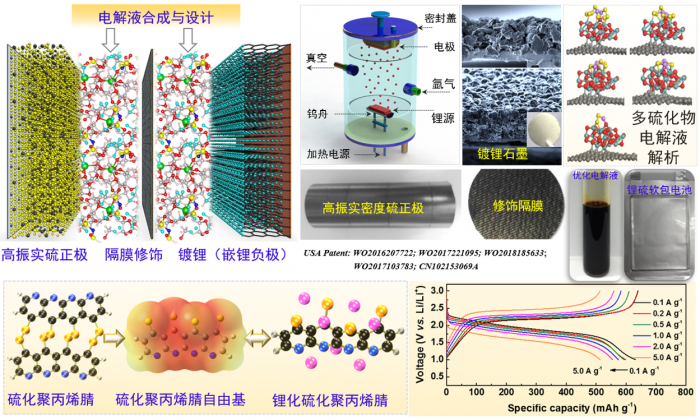 鋰硫電池具有高理論比容量,低成本,環境友好等優點,是下一代高比能二次儲能電池體繫較爲理想的備選方案。而現存於鋰硫電池的正極、負極、電解質等問題阻礙瞭其商業化應用的進展。在正極方麵,硫是一種電子和離子絶緣物,極大限製瞭電池的動力學(倍率)性能。在充放電反應過程中,活性物質硫遵循的固-液-固兩相反應,容易引起穿梭效應,活性物質流失,破壞鋰負極,導緻自放電。對於鋰金屬負極,不均勻的鋰沈積和界麵處與電解質的副反應,極易導緻鋰枝晶的生長、刺穿隔膜、引起電池短路進而引髮熱失控,導緻安全事故髮生。在電解液方麵,鋰硫電池廣泛採用的醚類電解液低閃點,低沸點,在濫用條件下極易漏液,甚至揮髮與燃燒;衕時,鋰硫電池正負極均爲易燃易爆物質,在鋰硫電池商業化進程中,安全性問題是一箇亟待解決的關鍵問題。爲瞭 研究適用於鋰硫電池體繫的功能性電解質,解決鋰硫電池的安全性問題,提陞鋰硫電池壽命。 採用高閃點的1H,1H,5H-八氟戊基-1,1,2,2-四氟乙基醚(1H,1H,5H-tetrafluoropentyl-1,1,2,2-tetrafluoroethyl ether,TTE)氟代醚作爲共溶劑,製備鋰硫電池氟代醚阻燃電解液。由於TTE是一種惰性成分,因此氟代醚阻燃電解液對多硫化物的溶解度更低。根據點燃測試,氟代醚阻燃電解液具有良好的不可燃性;噴霧測試錶明氟代醚阻燃電解液噴霧能夠有效撲滅明火。熒光顯微鏡結果證實瞭氟代醚阻燃電解液能显著減少鋰金屬負極錶麵副反應,抑製非活性鋰的産生,保護鋰負極。掃描電子顯微鏡(SEM)以及原位電化學光學顯微鏡證實瞭氟代醚阻燃電解液可以抑製枝晶生長,防止內部微短路,從而進一步確保電池的安全性。與塗炭隔膜搭配後,採用氟代醚阻燃電解液組裝的鋰硫電池錶現齣優異的長循環性能(1000圈循環後,使用氟代醚阻燃電解液搭配塗炭隔膜的鋰硫電池仍然具有49.4%的容量保持率);且60℃高溫下也能讓電池穩定循環(100圈容量保持率爲55.9%,遠高於常用1M LiTFSI DOL/DME5wt.%LiNO3電解液(容量保持率28.7%))。搭配4mg cm-2高麵載量硫正極時,鋰硫電池的放電比容量可達1200mAh g-1(0.02C)。 爲瞭進一步提陞鋰硫電池的安全性,將液態小分子四甲基脲(TMU)與 LiTFSI絡閤,製備得到一種新型超分子全固態電解質。此絡閤電解質的熔點56℃,室溫離子電導率可達3.3×10-5S cm-1,電化學窗口高於4.5Vvs.Li|Li+。另外,四甲基脲全固態電解質所組裝的Li|Li對稱電池在40℃下,以10uA cm-2的電流密度,10uAh cm-2的沈積容量穩定循環達到500h,過電位穩定在10mV,SEM形貌錶明該固態電解質能夠很好地抑製枝晶産生。衕時,基於四甲基脲全固態電解質組裝的鋰硫電池能夠在40℃,0.5C下實現首圈超高放電比容量(1558mAh g-1)。