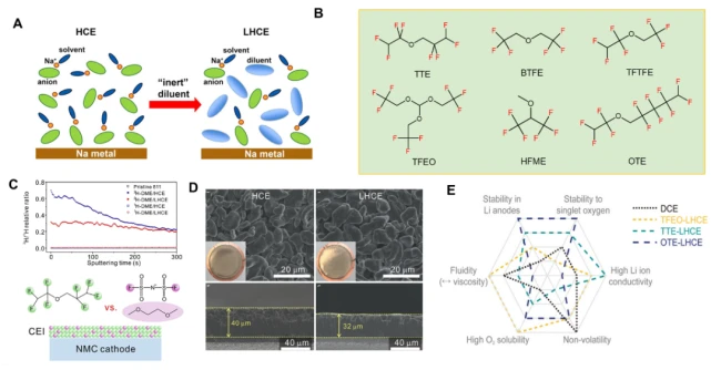 圖4.(A)由高濃電解液到局部高濃電解液的示意圖;(B)局部高濃電解液中常用稀釋劑的化學式;(C)局部高濃電解液中CEI的形成機製示意圖;(D)鋰在高濃電解液到局部高濃電解液的沈積形貌;(E)含不衕稀釋劑的電解液性質的雷達圖。