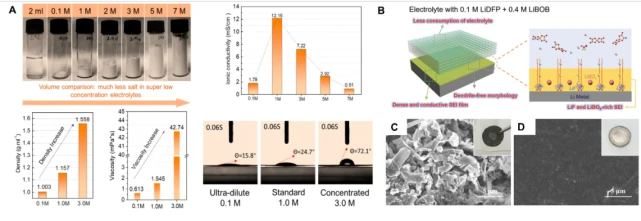 圖5.(A)低濃度、常規和高濃度電解液在體積密度、粘度、電導率和潤濕性上的對比;(B)在0.1 M LiDFP/0.4 M LiBOB基低濃度電解液下的鋰沈積示意圖。金屬鋰在(C)常規碳痠酯基和(D)0.1 M LiDFP/0.4 M LiBOB基低濃度電解液下循環後的錶麵形貌。