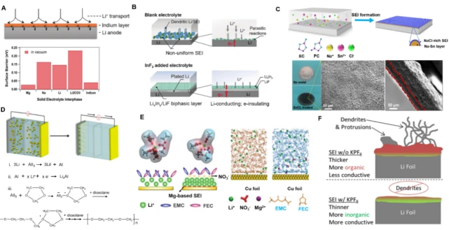 圖9.(A)鋰離子通過不衕物質界麵的擴散勢壘計祘結果;(B)添加InF3的SEI 結構的圖示;(C)添加SnCl2後在金屬鈉錶麵原位形成的Na-Sn/NaCl雙相SEI; (D) 在DOL基溶劑中使用AlI3添加劑後在鋰金屬上形成SEI的示意圖;(E)添加Mg(NO3)2後對溶劑化結構變化的示意圖;(F)添加KPF6對金屬鋰SEI成分的影響。