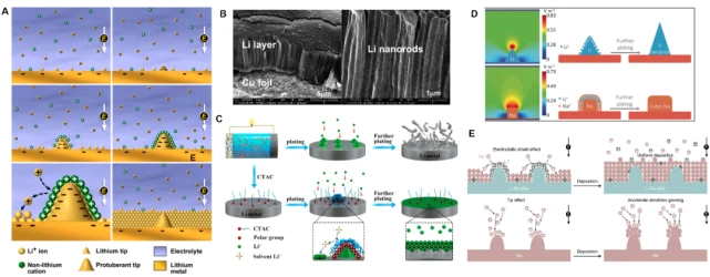 圖10. (A)SHES機製下使用非鋰陽離子添加劑的鋰沈積過程示意圖。(B)使用 CsPF6對鋰沈積形貌的影響;(C)CTAC對鋰沈積過程的影響示意圖。(D)形成混閤鋰/鈉鍍層對電場強度分佈的影響;(E)使用Li-Na閤金電極抑製枝晶的圖示。