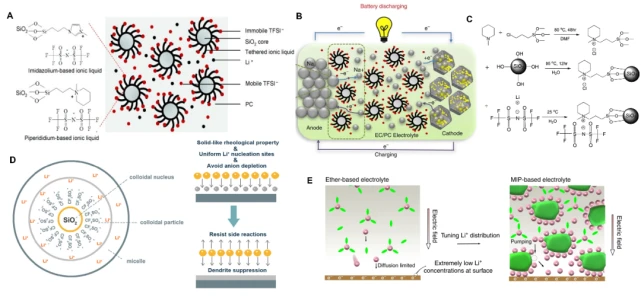 圖12. (A)SiO2-IL-TFSI添加劑的功能示意圖;(B)加入SiO2-IL-ClO4添加劑的Na/S電池示意圖,(C)SiO2-IL-TFSI的閤成流程圖;(D)SiO2疏水硅溶膠添加劑在離子吸附和枝晶抑製上的作用示意圖;(E)醚基和矇脫石基電解液中Li+沈積行爲