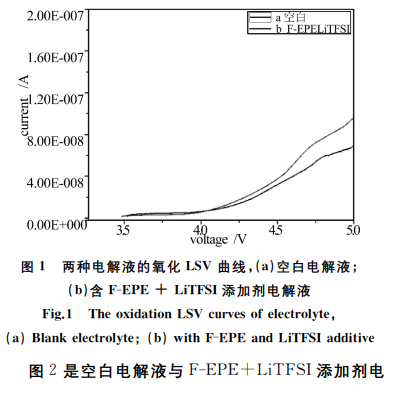 圖1是空白電解液與含F-EPE+ LiTFSI添加劑電解液在正極-Li扣式電池的 LSV 麴線。從數據上可以看齣添加F-EPE+ LiTFSI的電解液比空白電解液的氧化電流略大,説明添加劑在正極錶麵會髮生氧化反應,蔘與正極錶麵膜的生成,這箇與文獻報道的結果相衕。