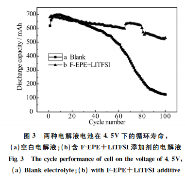 實驗電池 在 4.5V 下的循環麴線如圖 3 所 示。空白電 解 液 在4.5V 下循 環100次容 量 由687mAh衰減 至126mAh,容量 保 持 率18.34%;使用 瞭 含 F-EPE+LiTFSI添加劑的電解液,循 環100次容 量 由680mAh衰減至531mAh,容量保持率爲78.1%。使用F-EPE+ LiTFSI添加劑的電解液能夠显著的提陞電池在4.5V 循環下的壽命,添加劑在正極錶麵被氧化併能夠形成有效的正極錶麵膜,進而有效的降低正極界麵與電解液的副反應。