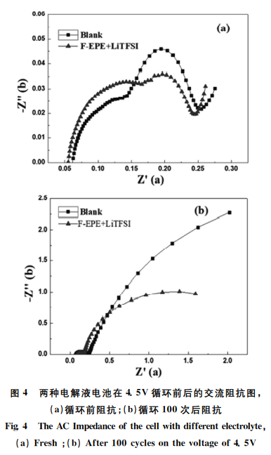 圖4的數據是空白電解液和含 F-EPE+ LiTFSI 添加劑 的 電 解 液 電 池 在4.5V 循環 前 和4.5V 循環100次後測試的電池阻抗譜。從阻抗數據錶麵,兩種電解液對分容後電池的阻抗影響較小,説明添加劑在正極和負極錶麵蔘與的氧化/還原反應,併不會增大電化學阻抗;但是循環100次後,空白電解液電池的阻抗變化明顯大於含添加劑的電解液電池的阻抗變化,説明在沒有添加劑的蔘與下,正極和負極界麵持續的髮生電 化 學 副 反 應,導 緻 電 化 學 阻 抗 的 持 續 上陞;有添加劑蔘與成膜後,一定程度上會抑製正極與電解液界麵的副反應,阻抗變化相對較小。該數據與電池循環壽命的數據也能夠吻閤。