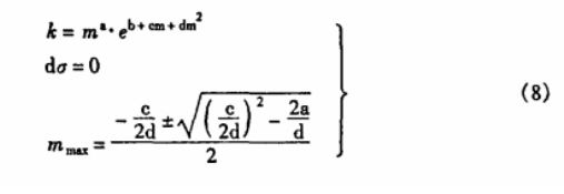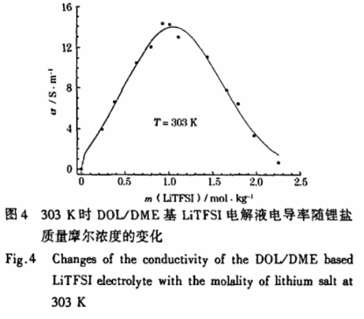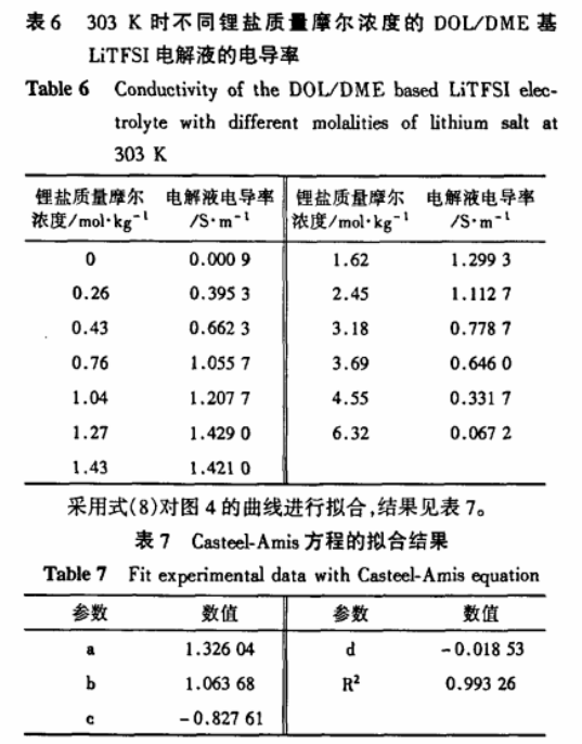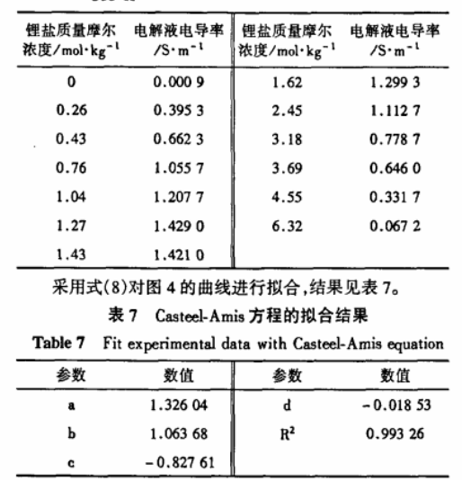 從錶7可知, 數據擬閤的R2值接近於l, 錶明採用帶修正項的Casteel-Amis方程可很好地描述DOL/DME基 LITFSI電解液電導率隨鋰鹽質量摩爾濃度的變化。 從圖4可知,隨著鋰鹽質量摩爾濃度的增加, 電解液的電導率先陞高, 後降低, 電解液電導率存在一箇極值。 式(7)是電解液電導率存在極值的條件, 式(7)的有意義解[由式(8)求得]卽電導率爲極值時的鋰鹽質量摩爾濃度。