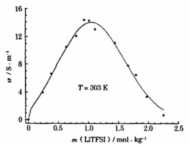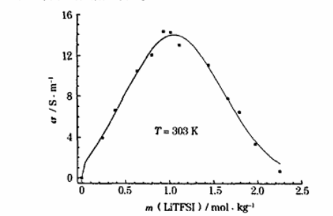 對於鋰鹽濃度大於l mol/L的電解液, 常見的稀溶液電導方程已不再適用; 對高濃電解液數據的擬閤, 常採用經驗或半經驗方程來描述。不衕鋰鹽在不衕混閤溶劑中的電導數據, 併預測鋰鹽在溶液中的電導特性。