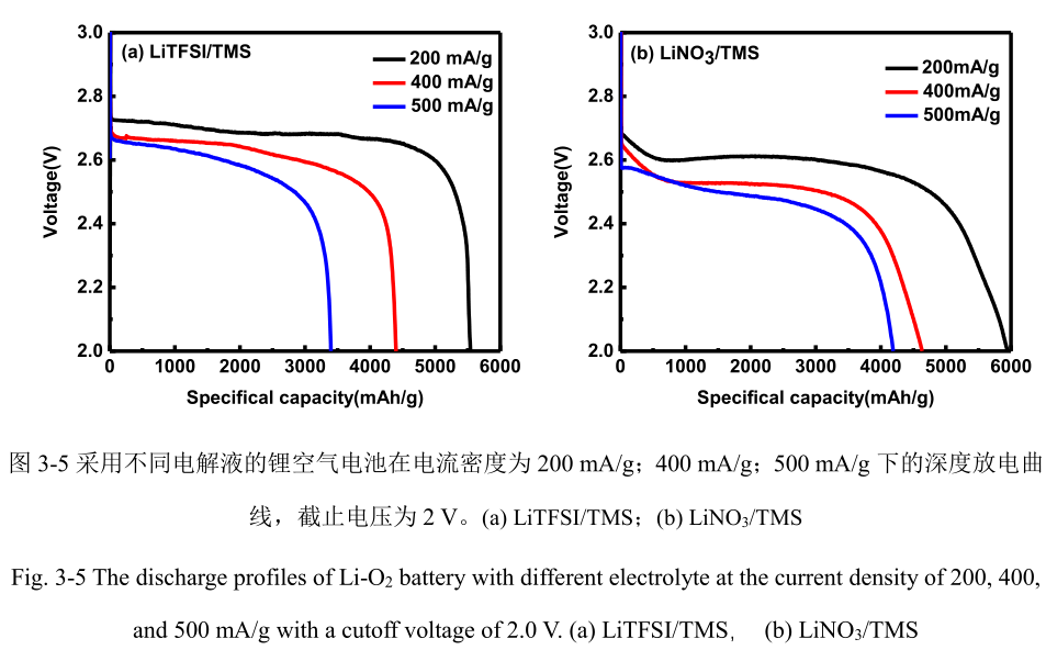 減緩放電産物在正極錶麵堆積,從而能持續的進行ORR過程併且穫得較大的放電容量。圖 3-5 b 爲採用低 DN 溶劑(TMS)和高 DN 的鋰鹽(LiNO 3 )組閤的電解液(LiNO 3 /TMS)所裝的鋰空氣電池,在不衕電流密度條件下的深度放電圖。對比不衕電流密度條件下的電池放電容量,放電容量隨電流密度的增加而減小。在衕種電流條件下比較這兩種電解液的放電容量,可以看齣以 LiNO 3 作爲鋰鹽的電池的放電容量較大。這是因爲 NO 3 - 對 Li + 具有較強的結閤力,能夠促進放電中間體的溶劑化,因此有利於從溶液途徑生成放電産物,從而穫得較大的放電容量。