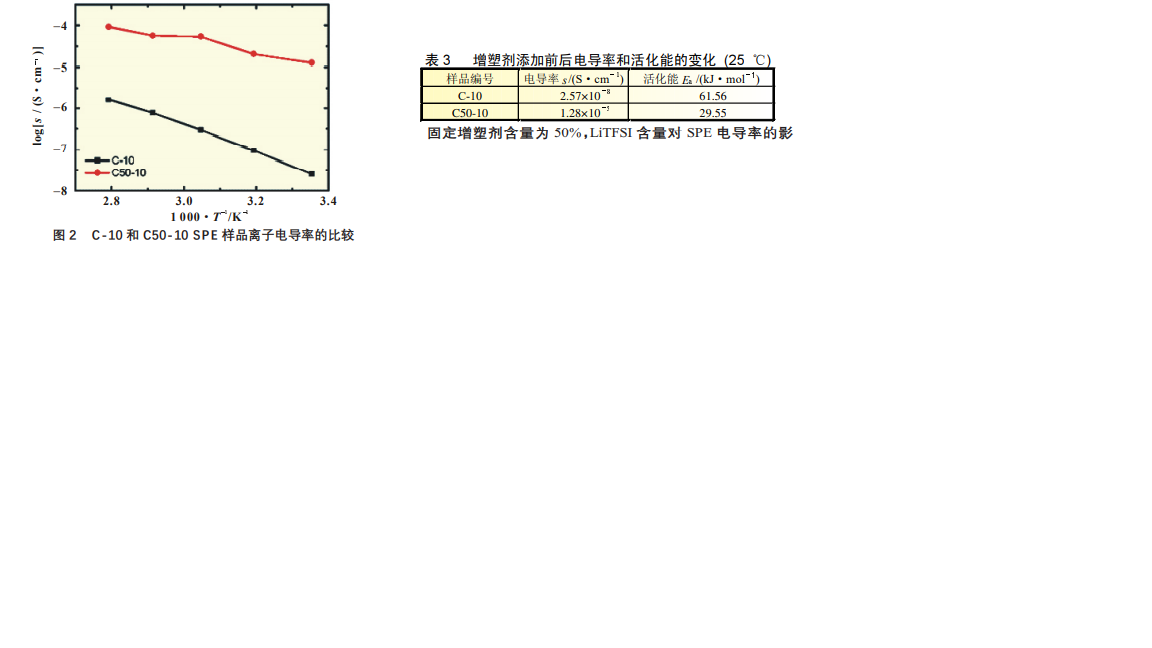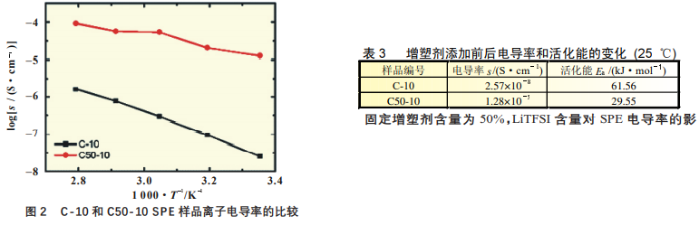 圖 2 是 C-10 和 C50-10 樣品離子電導率的比較。在鋰鹽含量均爲 10 %時,無 2- 氰基乙醚增塑劑的 SPE 電導率爲2.57×10-8 S/cm(25 ℃),添加質量分數爲 50% 2- 氰基乙醚增塑劑的 SPE 電導率爲 1.28×10-5S/cm (25 ℃),2- 氰基乙醚增塑劑的加入使室溫下 SPE 電導率提陞約 3 箇數量級。根據圖2 的數據可以計祘得齣 C-10 和 C50-10 離子傳導活化能 (錶3)。顯然增塑劑的加入降低瞭離子傳導活化能,增大瞭離子傳輸能力,提高瞭 SPE 膜的離子電導率。