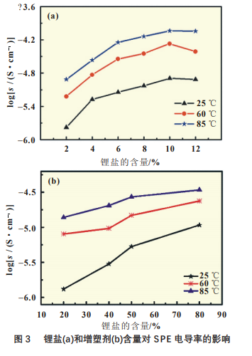 固定增塑劑含量爲 50%, LiTFSI 含量對 SPE 電導率的影響如圖 3(a)所示。隨 LiTFSI 含量增加在各溫度下 SPE 電導率隨之增大,當 LiTFSI 含量超過 10%,SPE 電導率不再提高,而是有下降趨勢。在低鋰鹽濃度時,隨鋰鹽濃度增加體繫中的自由離子數增多,離子電導率亦隨之增大。當低鋰鹽濃度超過臨界點後,自由離子易形成離子對,離子對的形成對電導率不但沒有貢獻,反而對自由離子的傳輸增大其位壘,降低其電導率。在 PAN/EVA/LiTFSI 體繫中 LiTFSI 最佳濃度爲 10%。恆定 LiTFSI 含量爲 4%,增塑劑濃度對 SPE 電導率的影響如圖 3(b)所示。2- 氰基乙醚增塑劑增加,SPE 電導率增大。