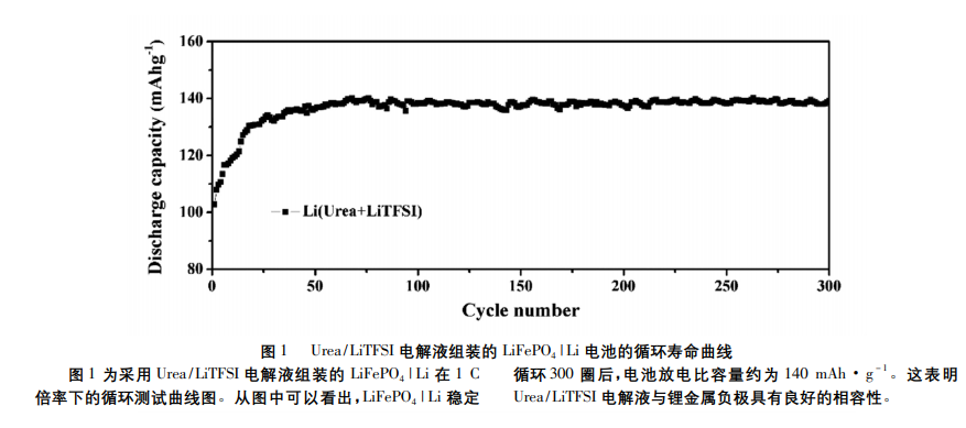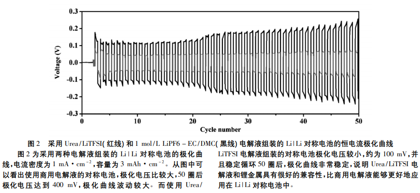 1991 年,索尼公司將鋰離子電池商業化。自此以後,鋰離子電池在電子産品中迅速髮展。現如今,電動汽車的迅速髮展,對高比能鋰離子電池的需求更加迫切。然而,目前最先進的鋰離子電池的能量密度隻能達到 250 Wh·kg - 1,已經不能滿足高比能的要求。鋰金屬負極具有超高的理論比容量( 3860mAh·g - 1) ,開髮鋰金屬電池能夠實現高能量密度的要求。然而,目前傳統的商用電解液不能很好地應用於鋰金屬電池中,這主要是因爲鋰金屬具有強還原性,與電解液會髮生副反應,形成鋰枝晶。鋰枝晶在電池循環過程中會進一步生長,刺穿隔膜,導緻電池短路甚至髮生爆炸。此外,傳統商用電解液的電化學窗口比較窄、易揮髮、易燃等缺點也進一步限製瞭其在鋰金屬電池中的應用。深共融溶劑主要由氫鍵受體( 季銨鹽、兩性離子等) 和氫鍵供體( 尿素、三氟乙醯胺等) 組成。作爲新型的離子液體( ILs) ,深共融溶劑具有高離子電導率、良好的熱穩定性和較寬的電化學窗口等諸多優點。據報道,尿素( Urea) 和 雙三氟甲烷磺醯亞胺鋰鹽( LiTFSI) 可以在室溫下形成深共融體繫,錶現齣良好的離子電導率,能夠應用於鋰離子電池中。然而,目前關於尿素基深共融電解液應用於鋰金屬電池中的報道相對較少。基於此,本文將 Urea /LiTFSI 形成的深共融電解液應用於LiFePO4 | Li,Li | Li 對稱電池。結果錶明該電解液在 LiFePO4 | Li電池中能夠穩定循環 300 圈( 1 C 倍率) 。與傳統的商用電解液相比,Urea / LiTFSI 電解液組裝的 Li | Li 對稱電池錶現齣更小的極化電壓。