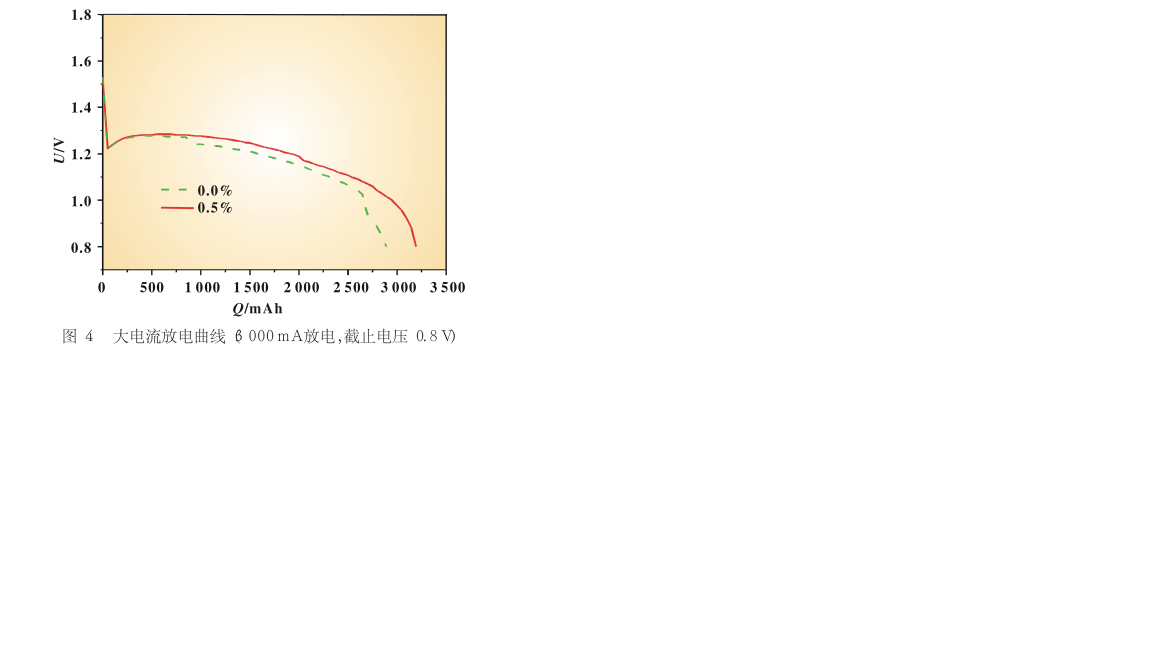 數碼相機和四驅車等電子産品對電池的倍率性能有較高的要求。 Li/FeS 2 的大電流放電性能如圖 4 所示,未添加 LiTFSI時, 室溫下用 3 000 mA 對 Li/FeS 2 電池進行放電, 容量爲2 887 mAh,電壓平颱爲 1.21 V。 當加入瞭 0.5%的 LiTFSI 添加劑時, 電池可以放齣 3 195 mAh 的容量, 電壓平颱爲 1.26 V。由於 LiTFSI 可以提高電解液的電導率, 因而可以改善電池的大電流放電性能。