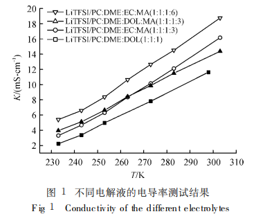 由測定各電解液體繫的電導率結果可知 (見圖1) LiTFSI 繫電解液無論常溫和低溫電導率明顯高於商用的電解液 (LiClO4/PC∶DME∶DOL).
