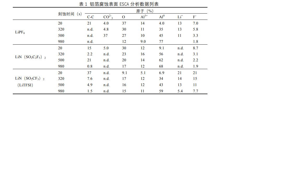 在衆多的鋰鹽中,磺痠類的鋰鹽所組成的電解液都有腐蝕鋁箔現象,而 LiPF6 電解液卻沒有腐蝕鋁箔的現象,説明在電壓陞高的過程中,不衕的電解液體繫在鋁箔錶麵髮生瞭不衕的化學反應。Krause 等用光電子能譜化分研究瞭 LiPF6 體繫電解液與 LiN(CF3SO2)2、LiN(C2F5SO2)2 電解液體與鋁箔髮生電化學反應後,鋁箔錶麵的情況,如錶 1所示。 LiTFSI 體繫電解液中的鋁箔錶麵主要成分可能爲 LiF 以及部分 Al2O3,直鏈碳痠酯,併且隨著直鏈全氟取代的碳鏈的增長鋁箔錶麵的鈍化膜明顯變薄。而沒有腐蝕現象的 LiPF6電解液中鋁箔錶麵的主要成分,絶大多數的研究者認爲是更穩定的 LiF3。因此 LiTFSI 電解液腐蝕鋁箔的原因與其陰離子中的磺痠全氟碳鏈有關。