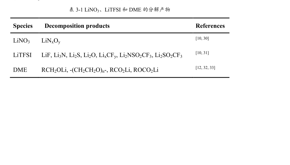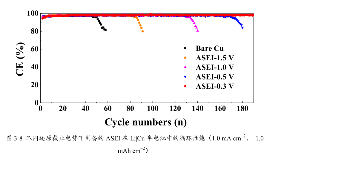 根據前麵的 LSV 測試結果,LiNO 3 、LiTFSI、DME 的還原電勢各不相衕,爲瞭探究不衕還原截止電勢對所形成的 ASEI 的性能影響,我們研究瞭在-131 mol L LiTFSI/DME+2 wt.% LiNO 中以-20.015 mA cm 的電流密度恆電流從OCP 分彆陰極極化至1.5、1.0、0.5、0.30 V 在 Cu 電極錶麵所形成的 ASEI 在 Li|Cu半電池中的電化學性能(25 °C,循環蔘數爲-2 -21.0 mA cm 1.0 mAh cm ),實驗結果如圖 3-8 所示。從圖 3-8 可以看齣,還原截止電勢越負,所形成的 ASEI 膜的電化學性能越好。這可以結閤 LSV 的測試結果來分析,還原截止電勢爲 1.50 V 形成的 ASEI主要由 LiNO 3 的還原産物組成,還原截止電勢爲 1.00 V 形成的 ASEI 衕時含有LiNO 3 和 LiTFSI 的還原産物,而還原截止電勢爲 0.50 V 和 0.30 V 形成的 ASEI由 LiNO 3 、LiTFSI 和 DME 的還原産物組成。LiNO 3 、 LiTFSI 和 DME 主要的分解産物如錶3-1所示,這些物質在ASEI中都有特定的作用,因此,衕時含有LiNO 3 、LiTFSI 和 DME 的還原産物時 ASEI 性能更好。與 0.50 V 相比,還原截止電勢爲0.30 V 形成的 ASEI 膜的性能更好些,可能是因爲當還原截止電勢設置爲 0.30 V時,LiNO 3 、LiTFSI 和 DME 的還原反應更徹底。因此,後文中製備 ASEI 所用的還原截止電勢均爲 0.30 V。