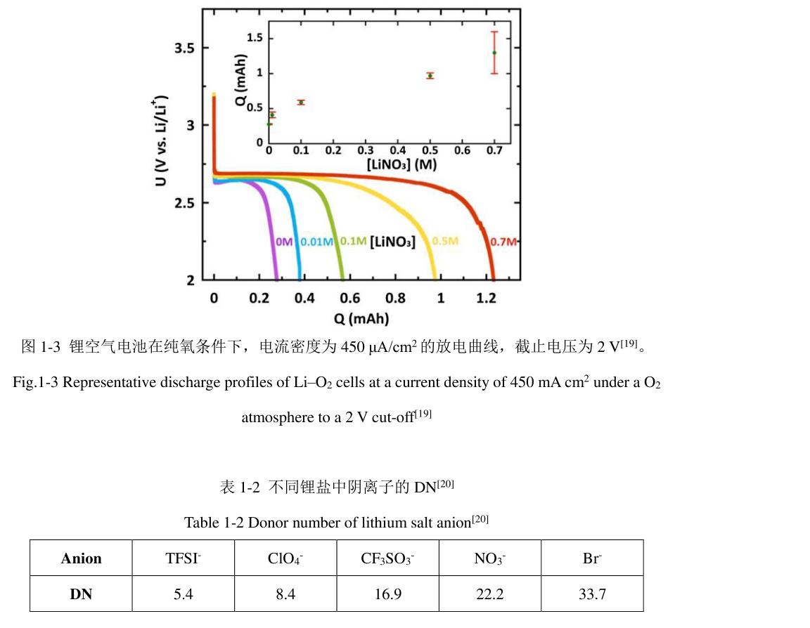 LiTFSI 時, 電池的放電容量最高。 這是因爲在鋰離子濃度較低的條件下, Li 2 O 2在碳錶麵上傾曏通過錶麵機理生長, 而在較高的鋰離子濃度下, 傾曏於溶液途徑生長 。除瞭鋰鹽陽離子的作用外,鋰鹽的陰離子在鋰空氣電池放電過程中可以促進中間體的溶解。