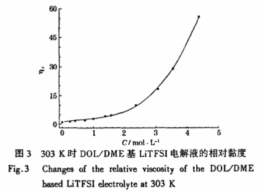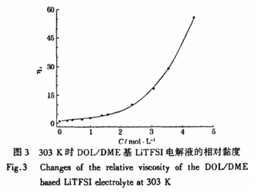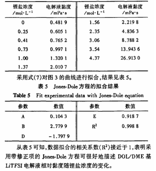 電解液黏度隨鋰鹽濃度的變化常用Jones-Dole方程來描述, 引入C2和G3的修正項, 使得描述更加精確。 帶修正項的Jones-Dole方程見式(7)。叩, =71/7/0=1+ACo-5+BC+DC2+EC3(7)式(7)中: 仉和可分彆是電解液的相對黏度和黏度, 珈爲溶劑的黏度, C是鋰鹽濃度, A、 B、 D和E是經驗常數。Acoj項通常對黏度是正貢獻, 牠與長程陰陽離子相互作用(離子氛)有關, 當鋰鹽濃度超過0. 1 mol/L時, 與其他項相比通常很低, 當考慮的電解液是中等濃度和高濃度時, 可以忽略。 BC在高鋰鹽濃度(0. 1。 1. 0 tool/L)電解液中較爲重要, 在非交聯極性非質子溶劑中, B常是正數。 DC2和EC3項僅在高鋰鹽濃度(通常C>0. 5 mol/L)時引入。 研究錶明, 離子固有的摩爾體積、 離子. 溶劑相互作用和離子. 離子相互作用, 可能對D和E有貢獻 。實驗測得, DOL/DME基 LiTFSI電解液相對黏度隨鋰鹽濃度的變化如圖3所示, 測試數據見錶4。