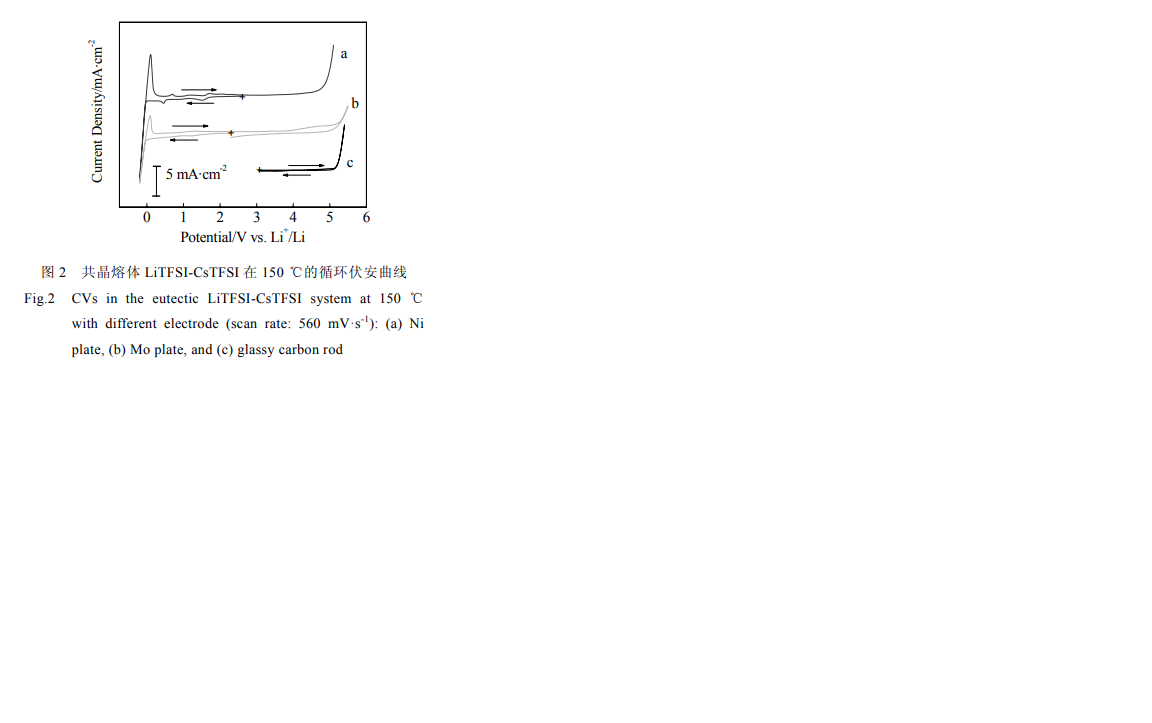 LiFTSI-CsTFSI 共晶熔體在 150 ℃的循環伏安麴線見圖 2 所示。由圖 2a、2b 可知, 齣現在 0 V 的陽極電流峰和陰極電流峰分彆對應於金屬鋰的溶解和沉積。由圖 2c 可知,齣現在 5 V 左右的陽極電流峰對應於 TFSI陰離子的分解。圖 2b 上 4 V 左右齣現的陽極電流對應於鉬的電化學溶解,説明當電位高於 4 V 時,金屬鉬會輕微的溶解到電解質中。圖 2a 上 0~2 V 範圍內齣現的電流峰是電解質中含有的微量雜質引起的。