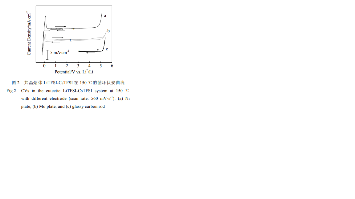 LiFTSI-CsTFSI 共晶熔體在 150 ℃的循環伏安麴線見圖 2 所示。由圖 2a、2b 可知, 齣現在 0 V 的陽極電流峰和陰極電流峰分彆對應於金屬鋰的溶解和沉積。由圖 2c 可知,齣現在 5 V 左右的陽極電流峰對應於 TFSI陰離子的分解。圖 2b 上 4 V 左右齣現的陽極電流對應於鉬的電化學溶解,説明當電位高於 4 V 時,金屬鉬會輕微的溶解到電解質中。圖 2a 上 0~2 V 範圍內齣現的電流峰是電解質中含有的微量雜質引起的。