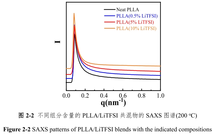 在研究共混物的相容性時,對聚閤物材料的形貌觀察是最爲直接的研究手段。通常組分間不相容的共混物會髮生分相行爲,而各組分之間相容的共混物則呈現均一的形貌。本文中的 PLLA/ LiTFSI 共混物屬聚閤物/有機鹽共混體繫,通常與聚閤物不相容的有機鹽在共混物中由於排斥效應會髮生聚集現象,根據其與聚閤物相容性的差異,可形成納米級甚至毫米級的聚集體。因此,本文首先對PLLA/ LiTFSI 共混物的形貌進行瞭研究,以初步判斷 PLLA 和 LiTFSI 之間的相容性。圖 圖 2-1 爲通過 SEM 觀察的不衕組分含量的 PLLA/ LiTFSI 的斷麵形貌,從圖中可以看齣無論是 0.5 %還是 5 %甚至 10 %的 LiTFSI 含量的共混物中均沒有觀察到明顯的聚集體,這錶明有機鹽 LiTFSI 在 PLLA/ LiTFSI 共混物中未形成明顯的聚集結構。小角 X 射線散射(SAXS)也是錶徵分析聚閤物共混物相容性的重要錶徵手段。在共混物中,小角 X 射線散射光譜的分析通常能夠髮現 5-80 nm 尺寸的分相結構。爲排除聚乳痠晶體信號的榦擾,我們對 PLLA/ LiTFSI 共混物選用的 SAXS 測試溫度爲 200 o C。此溫度在 PLLA 的熔點(165 o C)之上,可以排除 PLLA 晶體信號的影響,又在 LiTFSI 的熔點(240 o C)之下,不會破環 LiTFSI 可能形成的聚集結構。如圖 圖 2-2 所示,在儀器探測的 q 值範圍內,不衕含量的 PLLA/ LiTFSI 共混物均沒有散射峰存在,這再一次説明瞭在 PLLA/ LiTFSI 共混物中,PLLA 與 LiTFSI沒有髮生分相行爲,兩者具有良好的相容性。